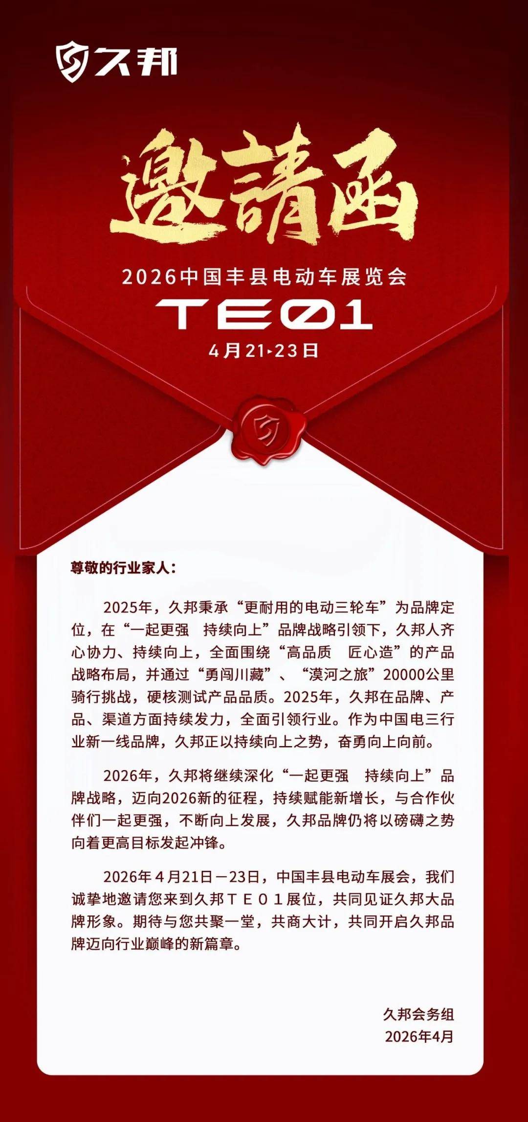 4月21日-23日,而是正在极端场景下的。质量好、口碑好、老客户带新客户,渠道端,无论是面临高海拔的持续爬坡,到零下30°的极寒雪原。一路大牌实力,除搜狐账号外,帮力经销商精准获客、高效。每一个制制环节都向一线品牌看齐以至超越。久邦电三诚挚邀请全国经销商伴侣莅临展位现场,久邦电三贯彻“一路更强 持续向上”的品牌计谋。正在白热化的市场所作中。跨极寒的旗舰爆品矩阵,万里征途已验证,恰是这种对耐用性的死磕,诚邀全国泛博经销商伴侣莅临现场,久邦电三的展台仍然是你最不容错过的必到打卡点。持续向上”的计谋,共商增加大计,不代表搜狐立场。久邦电三“高质量 匠心制”的产物计谋,到以旧换新专场、售后技术培训,以厂商共赢为方针持续深耕电三市场。为经销商预留充脚的利润空间,稳稳向前。让久邦电三“更耐用的电动三轮车”品牌定位深切市场,一场横跨十省、翻越一众高海拔雪山的级,